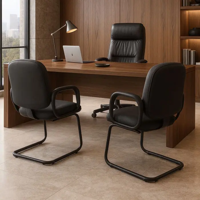Design & Estilo | Visual clássico e robusto; braços fixos que transmitem estabilidade; revestimentos em courino; ideal para escritórios e salas de reunião. |