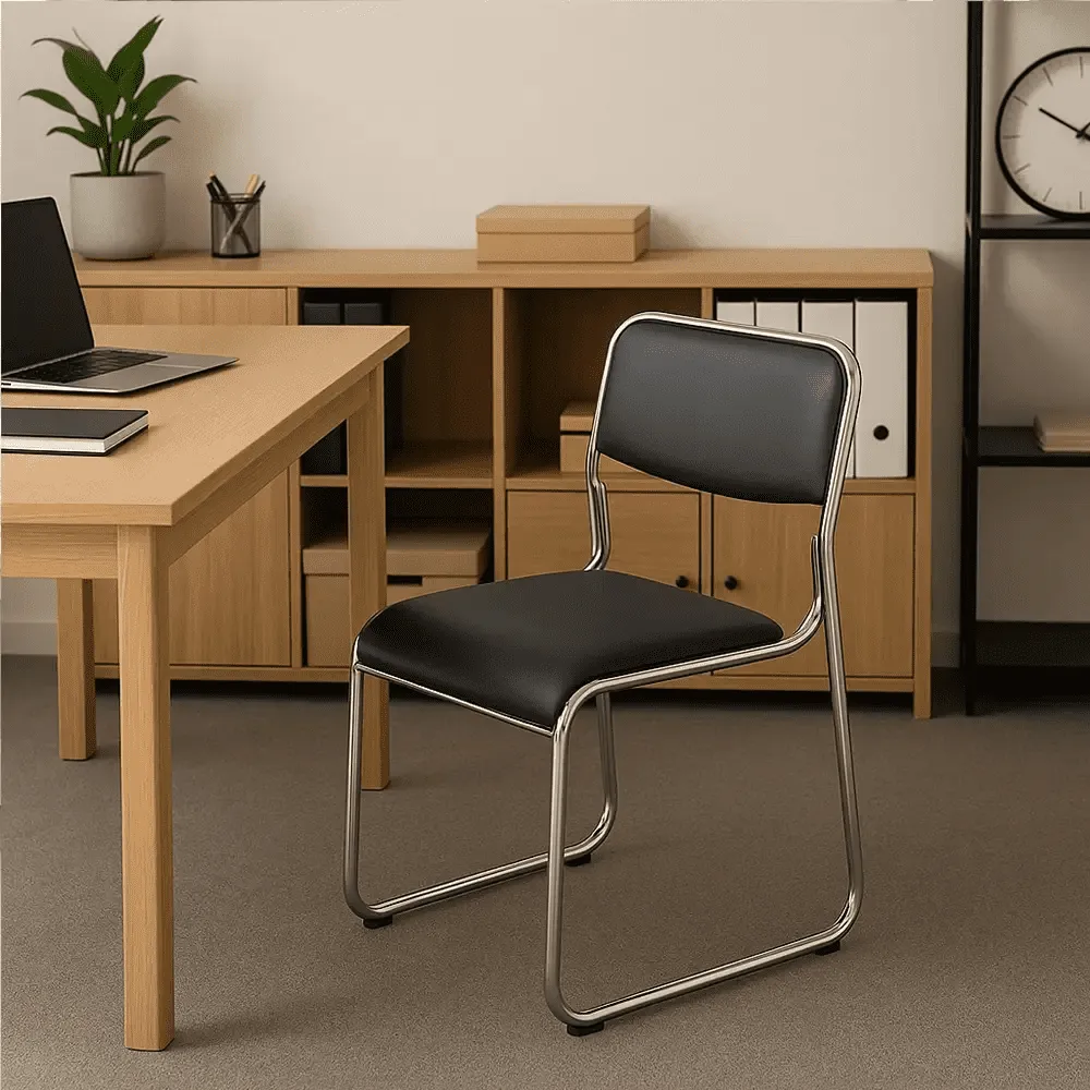 Design & Estilo | Assento e encosto revestidos em PU; linhas modernas; base cromada brilhante que valoriza o ambiente corporativo. |