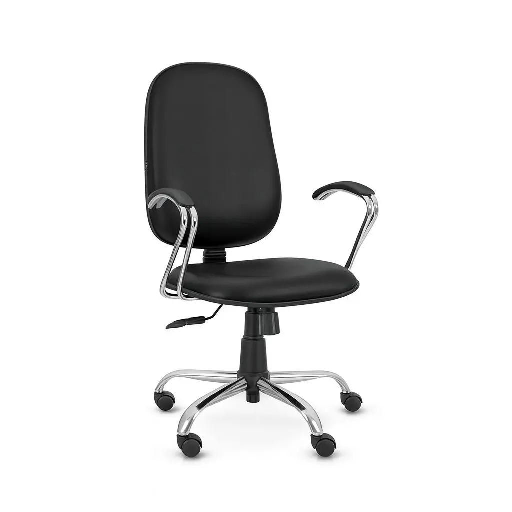 - Design e Estilo: Estrutura giratória robusta, braços cromados que trazem elegância e suporte, e encosto alto médio que proporcionam postura imponente.